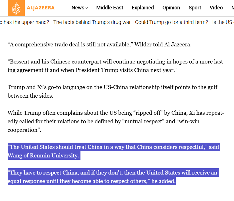 中美元首釜山会晤当天,王文在接受卡塔尔半岛电视台采访时表示,中美之间的结构性矛盾尚未得到解决。中国的实力正在增强,未来将超越美国。美国应当以中国所认同的尊重方式对待中国;若无法做到这一点,美国必将面临同等反制,直至其真正学会尊重他国。07当前谈中美蜜月期为时尚早