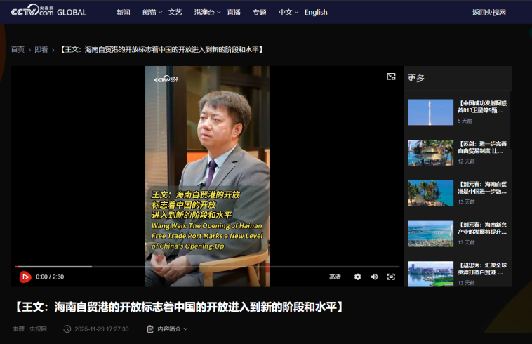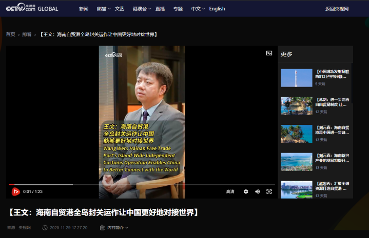 编者按:自2025年12月18日起,海南自由贸易港正式启动全岛封关,这一历史性时刻备受世界瞩目。中国人民大学重阳金融研究院院长、全球领导力学院院长王文就海南封关事宜接连接受《人民日报》、新华社、中央广播电视总台、《海南日报》等多家媒体专访,向国内外系统阐释封关的深远意义、制度红利与全球价值。相关内容在海内外引发热烈反响,现梳理发布如下: