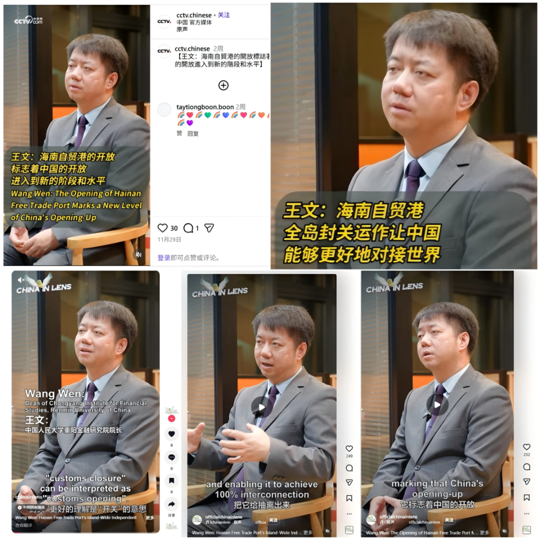 王文在采访中表述的“从‘政策优惠’到‘制度创新’的根本跃迁”、“中国与世界的新桥梁”、“中国高水平开放新阶段”等观点在Facebook、X、Instagram、TikTok等海外社交平台发布,精准触达海外政商学界及普通民众,在收获大量点赞的同时,引发了对于海南旅游、投资及政策开放度的普遍兴趣与讨论,有效参与了国际舆论场对中国开放议题的叙事构建。