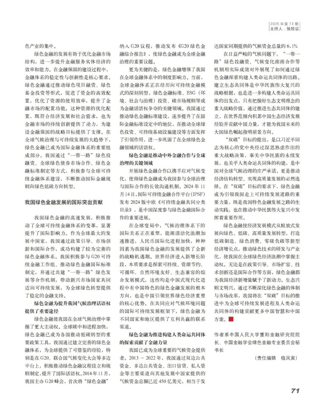 编者按:近日,中国人民大学重阳金融研究院院长、中国金融学会绿色金融专业委员会秘书长王文在《中国金融》2025年第13期发表评论文章指出,我国绿色金融的高速发展进程牢牢扎根于中国式现代化的发展需求,其发展内核不仅在于解决了应对环境污染、资源枯竭、气候变暖等挑战所需要的资金来源,更在于探索了一条超越西方传统金融发展模式的新路径。现将全文发布如下:(全文约6400字,预计阅读时间16分钟)