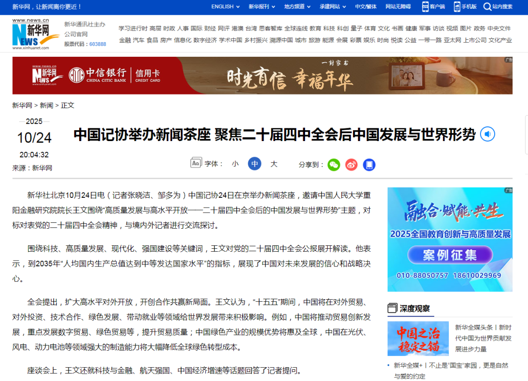 编者按:2025年10月24日下午,受中国记协“新闻茶座”邀请,中国人民大学重阳金融研究院院长、全球领导力学院院长王文做了主题为《人均GDP中等发达国家的中国意味着什么?——党的二十届四中全会公报解读》的报告,来自美国CNN、德国电视一台、日本共同社等100多位外国媒体、驻华使馆和港澳台记者报名参会。包括新华社、台湾中央通讯社在内的多家两岸四地及外国媒体报道了主题报告的相关观点。10月29日,国家发改委中宏网、凤凰网发布主题报告后王文与中外媒体的部分交流实录。现发布如下:(全文约9500字,预计阅读时间24分钟)