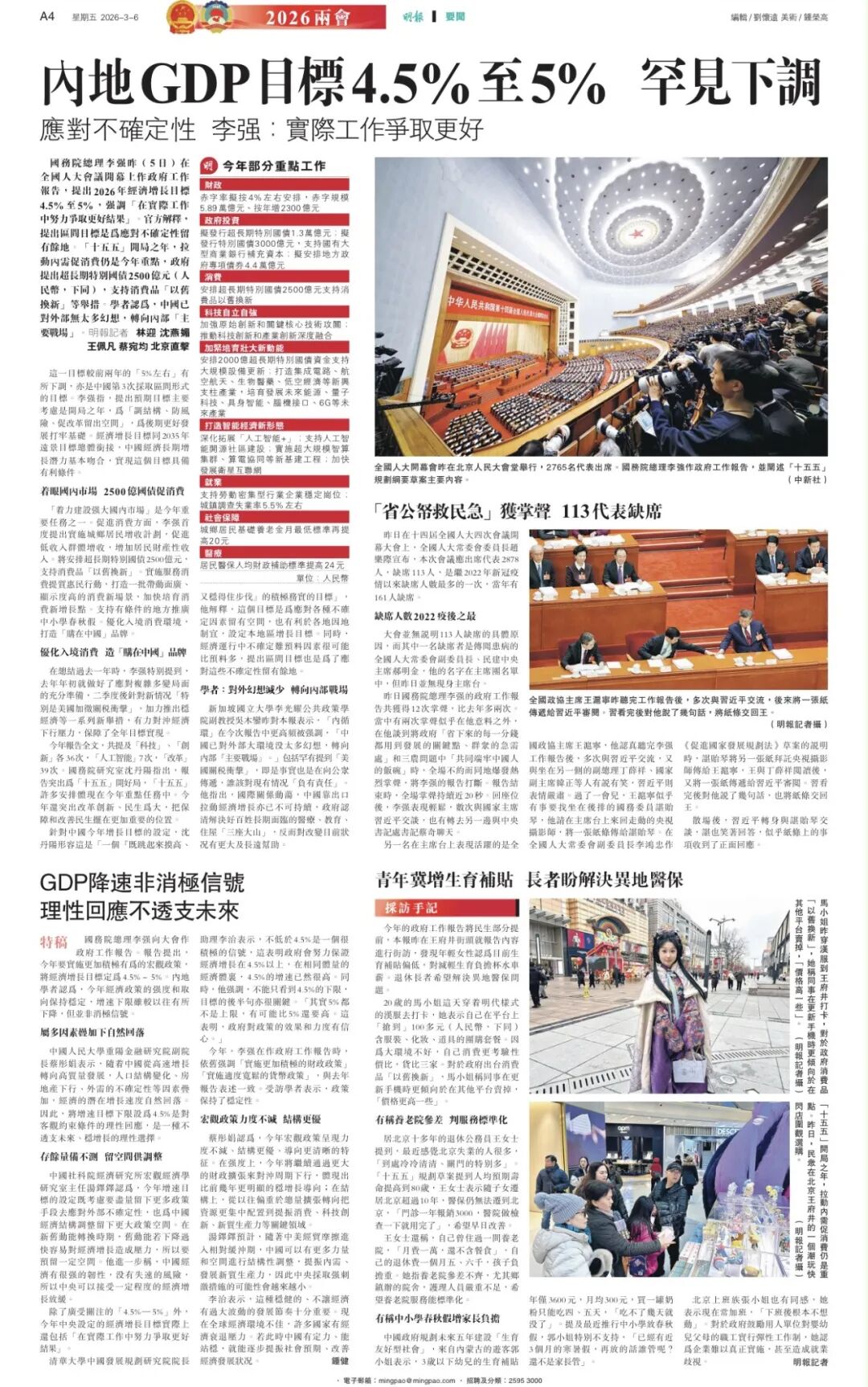 国务院总理李强向大会作政府工作报告。报告提出,今年要实施更加积极有为的宏观政策,将经济增长目标定为4.5%—5%。学者认为,今年经济政策的强度和取向保持稳定,增速下限虽较以往有所下降,但并非消极信号。