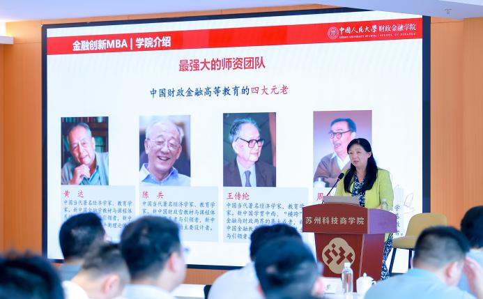 9月6日,由中国人民大学财政金融学院和苏州科技商学院联合主办,苏州市金融发展研究会及苏州市金融业商会协办的人大金融创新MBA公开课暨苏州专场宣讲会,在苏州东沙湖基金小镇成功举行。