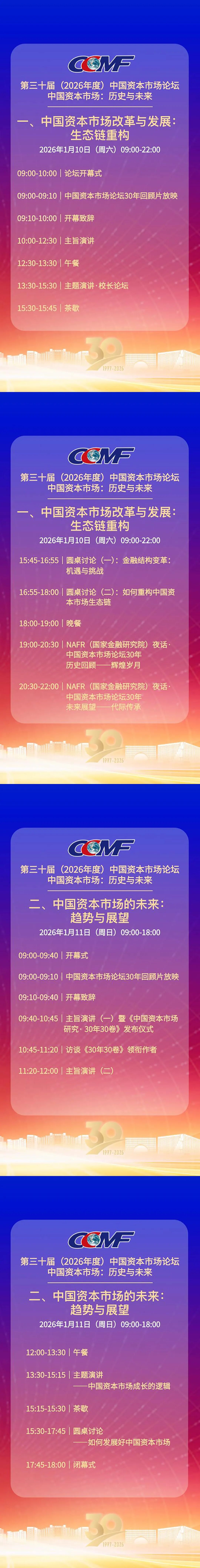 本届论坛既是对三十载历程的致敬,更愿成为凝聚共识、启迪思想、汇聚力量的新起点,以此推动中国资本市场在继承中创新、在开放中自强,共同迎接金融强国时代的到来。现将论坛议程发布如下: