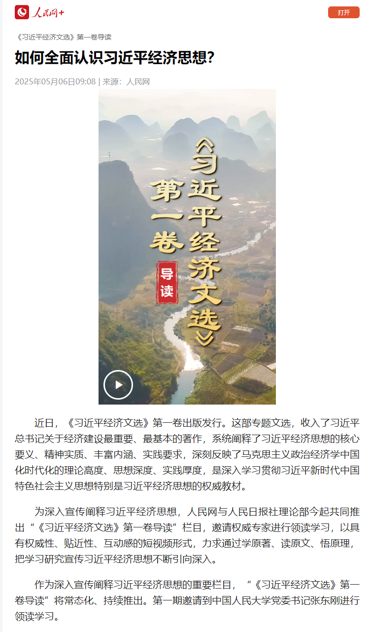 近日,《习近平经济文选》第一卷出版发行。2025年3月31日,《人民日报》理论版刊发中国人民大学党委书记张东刚教授署名文章 《全面认识习近平经济思想的理论贡献和实践伟力》 。5月6日,人民网与人民日报社理论部共同推出“《习近平经济文选》第一卷导读”栏目,邀请权威专家系列领读,第一期推出张东刚教授 领读视频 。