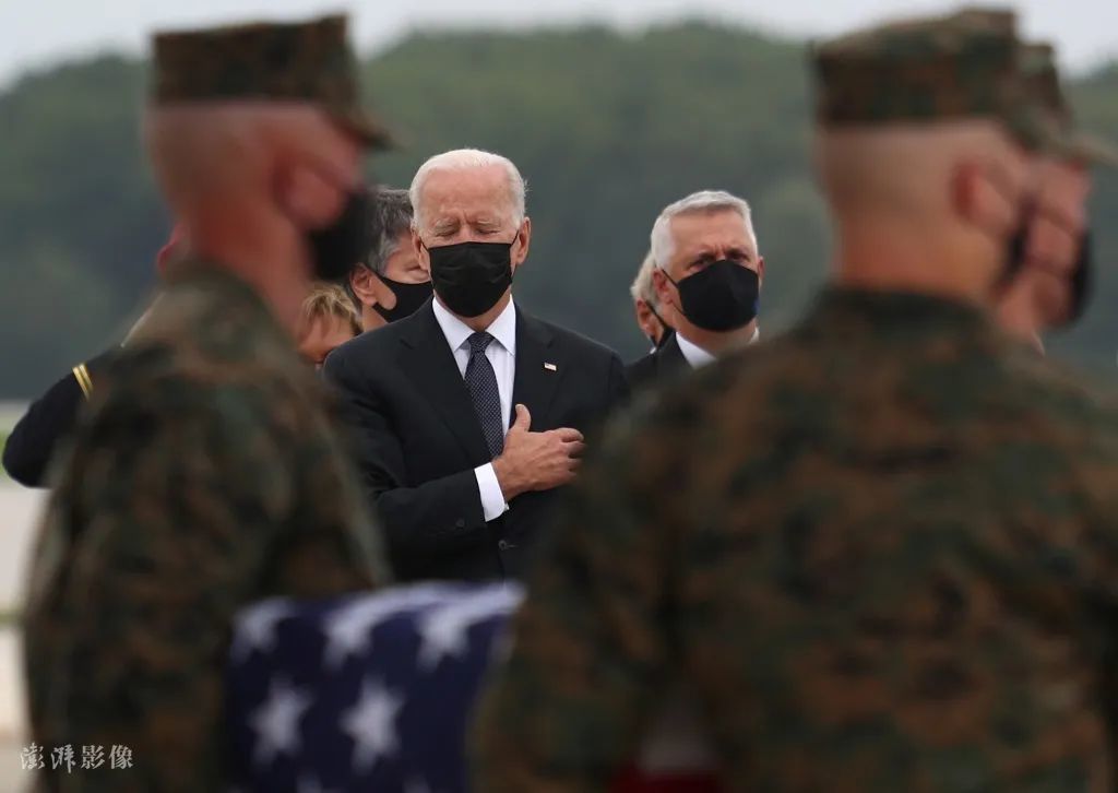 ▎当地时间2021年8月29日,喀布尔爆炸遇难美军士兵遗体运抵多佛空军基地,美国总统拜登亲自迎接。图源:IC Photo