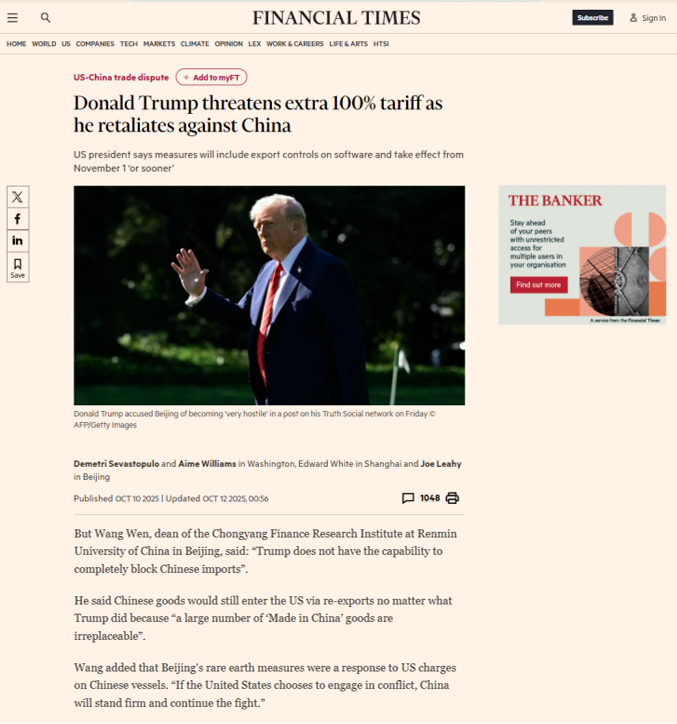 ▲10月10日,王文接受英国《金融时报》采访内容10月10日,王文接受英国《金融时报》采访时表示,美国无力封锁中国进口商品,因为多数中国制造具有不可替代性。中国稀土管制来反制美国对中国船舶征税,美国如果想与中国斗,中国一定会奉陪到底的。