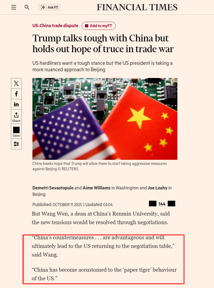 10月11日,英国《金融时报》再次引述王文观点:中美新的紧张局势将通过谈判解决。“中国的反制措施……是有利的,最终将促使美国重返谈判桌”,“中国已经习惯了美国‘纸老虎’的行为。”