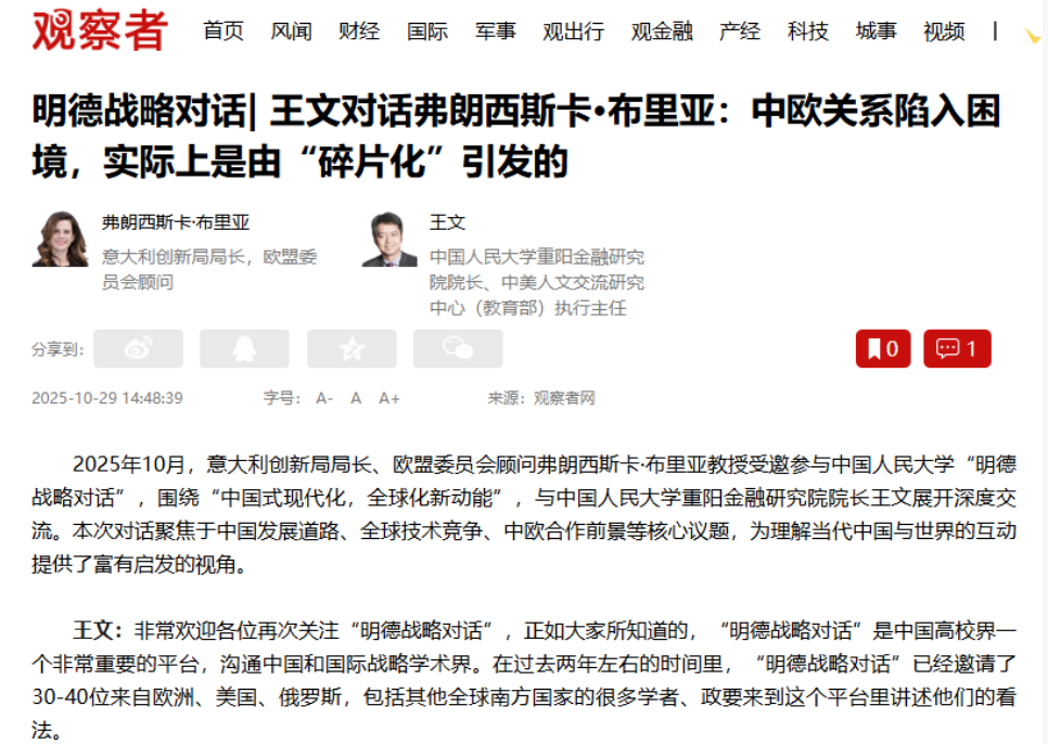 近日,在“明德战略对话2025”系列活动浙江温州站2025温商发展论坛上,中国人民大学重阳金融研究院院长、全球领导力学院院长王文对话德国著名媒体人、历史学家、克鲁斯曼传播与咨询公司创始人及首席执行官乌维·克鲁斯曼,欧盟委员会主席冯德莱恩顾问、意大利区域创新局主席、西班牙国际人工智能咨询委员会成员弗朗西斯卡·布里亚,米兰机场管理集团董事、IREN能源环保集团董事、原意大利总理府幕僚长丹尼尔·乔瓦尼,意大利摩德纳与雷焦艾米利亚大学应用经济学副教授乔治·普罗迪。