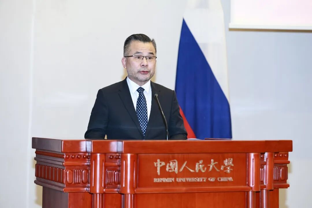 郑新业在致辞环节对伊戈尔·莫尔古洛夫大使一行的到来表示热烈欢迎。他指出,中俄关系在两国元首的战略引领下正步入更加成熟、更具活力的新阶段。中国人民大学作为中国共产党创办的第一所新型正规大学,与俄罗斯有着深厚的教育渊源,已与莫斯科国立大学等10余所俄知名高校建立了扎实合作,搭建了俄罗斯研究中心等高水平交流平台。面向未来,中国人民大学将进一步深化务实合作,开展中俄青年领袖计划及能源安全、人工智能等领域的联合研究,为中俄友好的世代传承注入新动力。