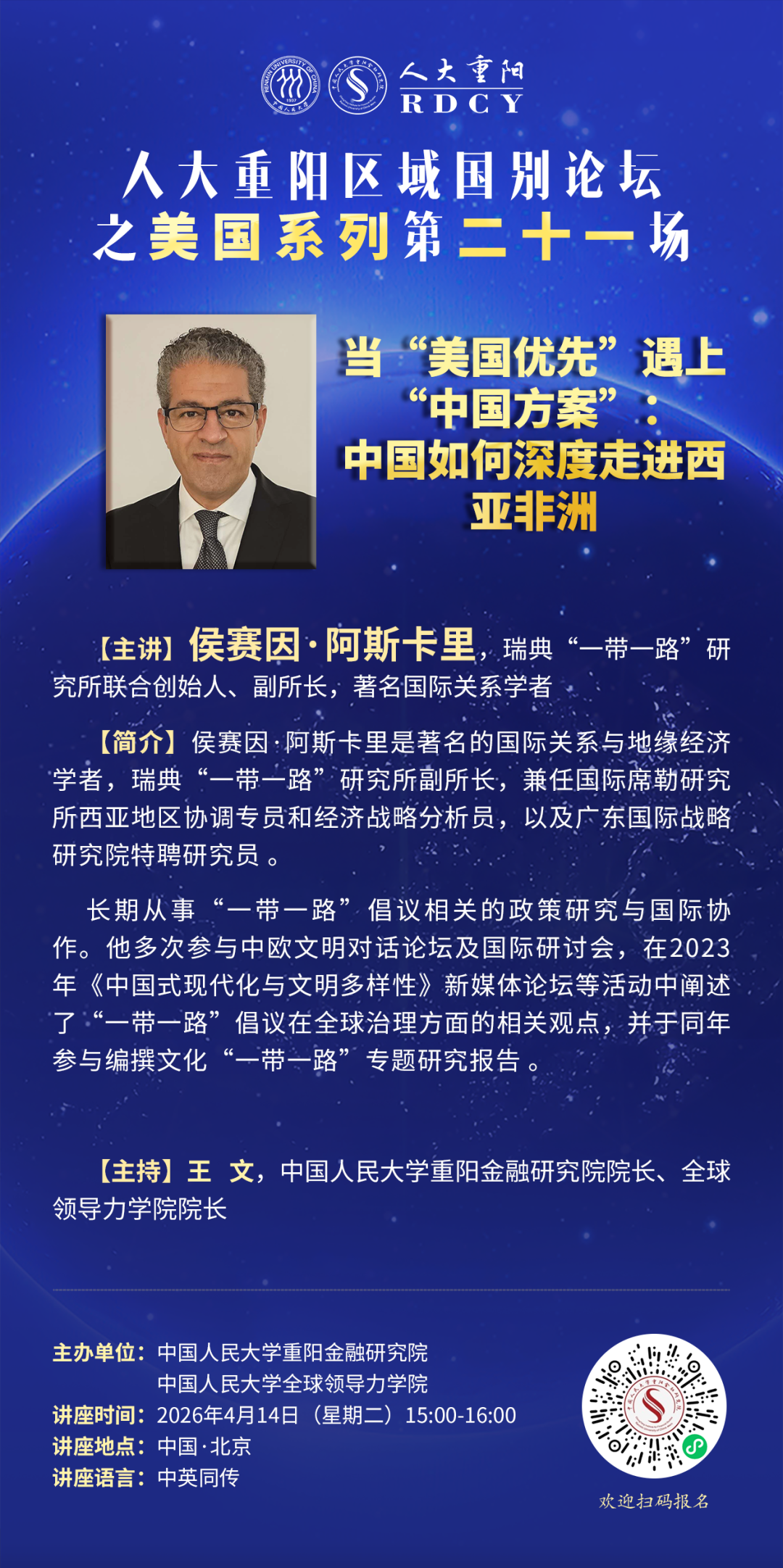 编者按:当西方的全球基建倡议仍停留在PPT和地缘政治幻想中时,中国的“一带一路”已将技术、工业与人口连结成实实在在的“发展走廊”。4月14日,瑞典“一带一路”研究所联合创始人、副所长,著名国际关系学者侯赛因·阿斯卡里(Hussein Askary)将做客人大重阳区域国别论坛之“美国系列”第二十一场并围绕其新合著著作《将新丝绸之路延伸至西亚和非洲》,深入探讨“一带一路”倡议对西亚与非洲的影响。现将相关议程安排如下: