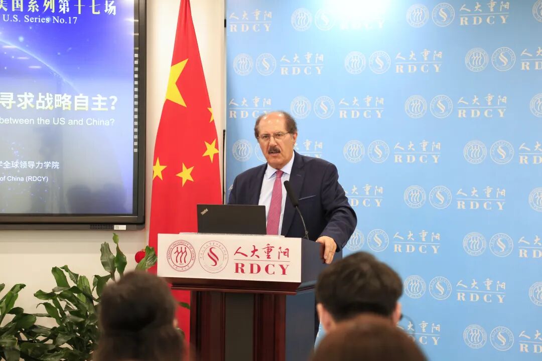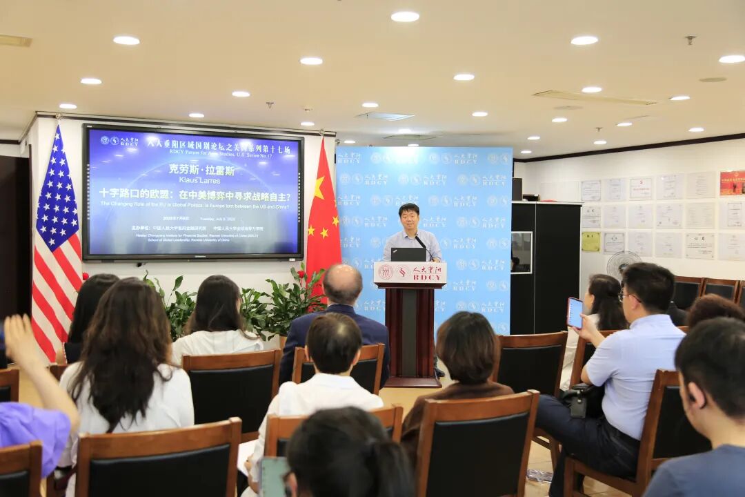 人大重阳网综合报道:7月8日,著名德国籍学者、美国威尔逊中心全球欧洲与基辛格美中关系研究所研究员、美国北卡罗来纳大学教堂山分校历史与国际事务教授克劳斯·拉雷斯(Klaus Larres)访问中国人民大学重阳金融研究院(人大重阳),在人大重阳区域国别论坛之“美国系列”第十七场活动中发表题为“十字路口的欧盟:在中美博弈中寻求战略自主?”的公开演讲,这是他继2024年9月之后第二次在人大重阳开讲。央视、北京日报、环球人物杂志、南华早报等媒体报道此次会议。