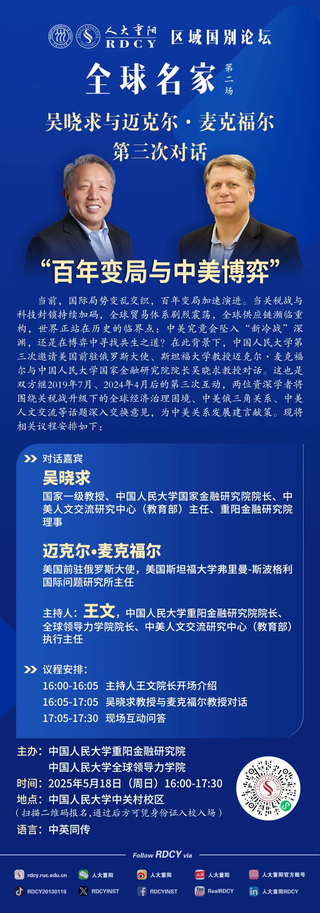 编者按:当前,国际局势变乱交织,百年变局加速演进。当关税战与科技封锁持续加码,全球贸易体系剧烈震荡,全球供应链濒临重构,世界正站在历史的临界点:中美究竟会坠入“新冷战”深渊,还是在博弈中寻找共生之道?在此背景下,中国人民大学第三次邀请美国前驻俄罗斯大使、斯坦福大学教授迈克尔•麦克福尔与中国人民大学国家金融研究院院长吴晓求教授在 人大重阳区域国别论坛之全球名家第二场 进行对话。这也是双方继 2019年7月 、 2024年4月 后的第三次互动,两位资深学者将围绕关税战升级下的全球经济治理困境、中美俄三角关系、中美人文交流等话题深入交换意见,为中美关系发展建言献策。现将相关议程安排如下: