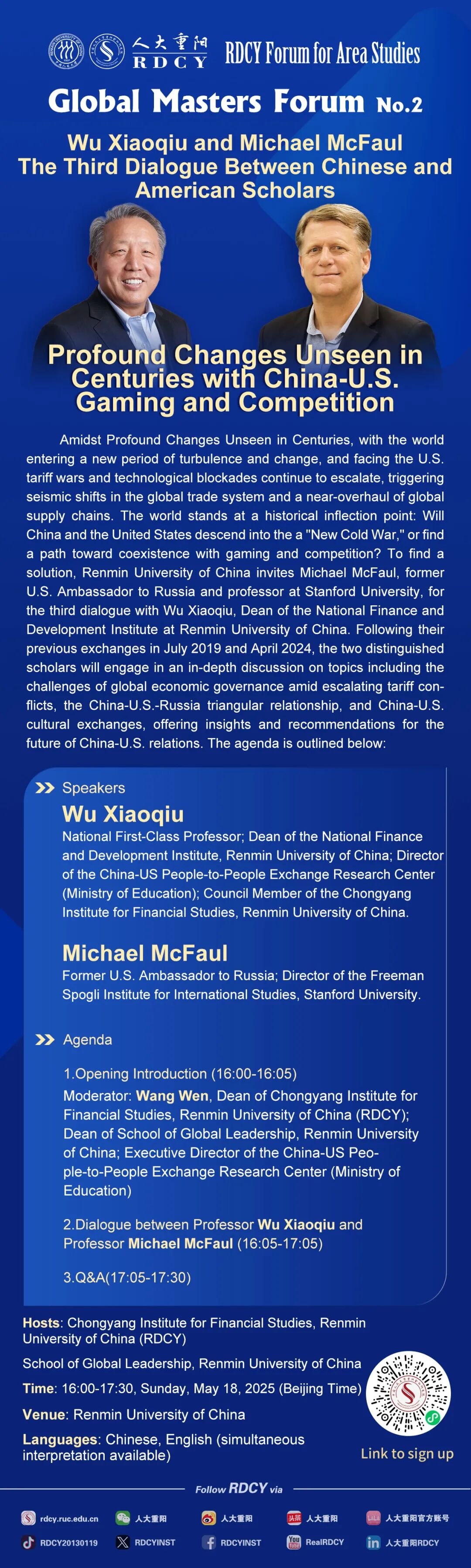 The Third Dialogue Between Wu Xiaoqiu and Michael McFaulProfound Changes Unseen in Centuries with China-U.S. Gaming and CompetitionAmidst Profound Changes Unseen in Centuries, with the world entering a new period of turbulence and change, and facing the U.S. tariff wars and technological blockades continue to escalate, triggering seismic shifts in the global trade system and a near-overhaul of global supply chains. The world stands at a historical inflection point: Will China and the United States descend into the a "New Cold War," or find a path toward coexistence with gaming and competition? To find a solution, Renmin University of China invites Michael McFaul, former U.S. Ambassador to Russia and professor at Stanford University, for the third dialogue with Wu Xiaoqiu, Dean of the National Finance and Development Institute at Renmin University of China. Following their previous exchanges in July 2019 and April 2024, the two distinguished scholars will engage in an in-depth discussion on topics including the challenges of global economic governance amid escalating tariff conflicts, the China-U.S.-Russia triangular relationship, and China-U.S. cultural exchanges, offering insights and recommendations for the future of China-U.S. relations. The agenda is outlined below: