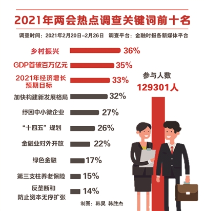 有重点,亦有亮点。除了关心“中国经济大方向到底怎么走”之外,从本次两会热点调查可以看出,2021年有不少新的亮点出现。例如有17%的参与者投了“绿色金融”一票,使其“跻身”榜单前列。“绿水青山就是金山银山”,在追求经济发展与环境协同的今天,可持续发展的理念逐渐深入人心。山东的张女士告诉记者,之所以选择“绿色金融”,是因为环境、气候和资源都与大家生活息息相关,希望通过绿色金融发展达到支持环境改善的作用。