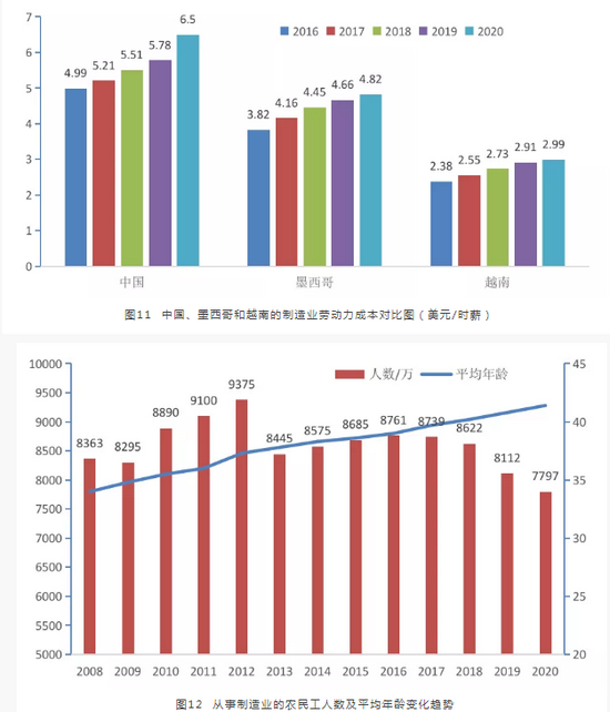 近年来,中国制造业的确面临不断加大的结构转型压力。首先是随着劳动人口结构和就业偏好变化,中国制造业在国际市场上逐渐丧失用工成本优势。2020年,中国制造业平均时薪从2016年的4.99美元上涨到6.5美元,累计上涨了30.3%,目前水平是墨西哥制造业平均时薪的1.35倍,是越南制造业平均时薪的2.17倍。
