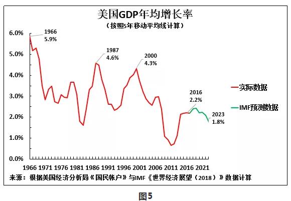 因为IMF预测的数据涵盖特朗普有可能的两任任期——八年中的七年,图4为大家呈现按照7年移动平均线计算的美国GDP年均增长率。与其他计算方法一样,按照这种方法计算的结果显示,美国经济正在稳步放缓:美国GDP年均增长率从1968年的 5.3%,降至1989年的4.4%, 2000年的4.0%, 2016年的2.2%。要在特朗普的两届任期内实现5-6%的增长率,特朗普政府就得实现过去五十年从未实现过的增速,而美国GDP年均增长率已系统性地放缓了五十年。
