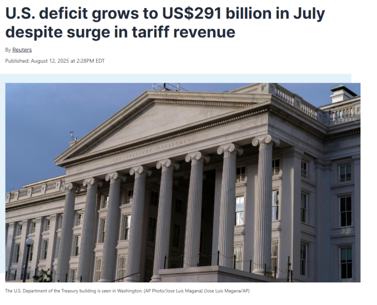 路透社的报道指出,美国总统特朗普曾表示,关税让“几十亿美元滚滚流入美国国库”。然而,尽管7月关税收入达到280亿美元,创下历史新高,却仍未能阻止预算赤字的扩大。
