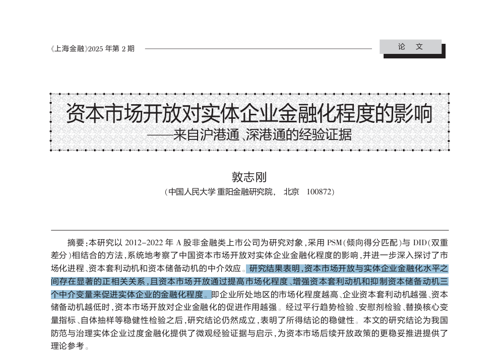 研究结果表明,资本市场开放与实体企业金融化水平之间存在显著的正相关关系,且资本市场开放通过提高市场化程度、增强资本套利动机和抑制资本储备动机三个中介变量来促进实体企业的金融化程度。