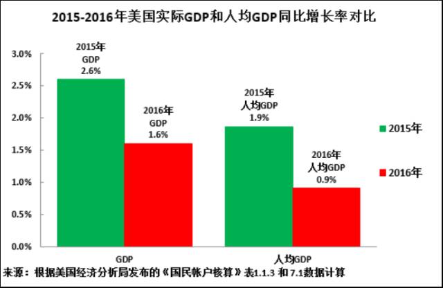 美国人均GDP增长率从2015年的1.9%降至2016年的0.9%,即美国2016年人均GDP同比下降一半多,接近于停滞。