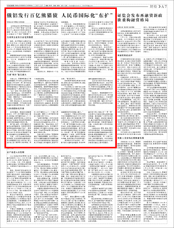 在专家看来,俄铝百亿熊猫债的发行,对于人民币国际化意义重大。标志着人民币国际化进入了一个新的高度,在俄罗斯市场上人民币也将开始广泛使用,而且由贸易结算的工具将变成投融资安排的工具。