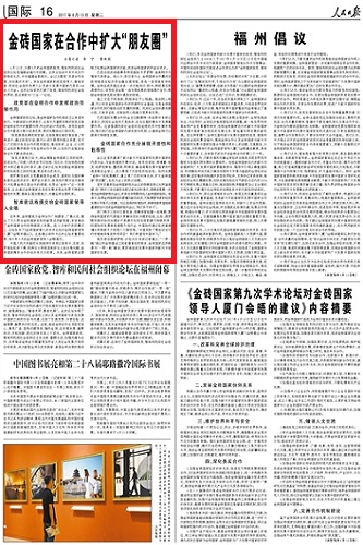 6月12日,为期3天的金砖国家政党、智库和民间社会组织论坛在福建省福州市闭幕。这次论坛由中共中央对外联络部主办,中共福建省委承办。会议主题是“共谋合作发展,共创美好未来”。来自金砖国家的政党领导人、智库学者、民间社会组织负责人以及部分发展中国家代表共400余人与会。这次论坛首次打破了政党、智库和民间社会组织界别,因此被称为“三合一”论坛。