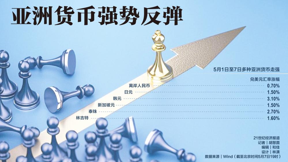 从市场表现来看,包括人民币、港元、日元、新加坡元等在内的亚太区货币兑美元均录得涨幅。其中,新兴市场货币表现更为亮眼,从5月1日至7日,MSCI新兴市场货币指数已经上涨了1.5%。