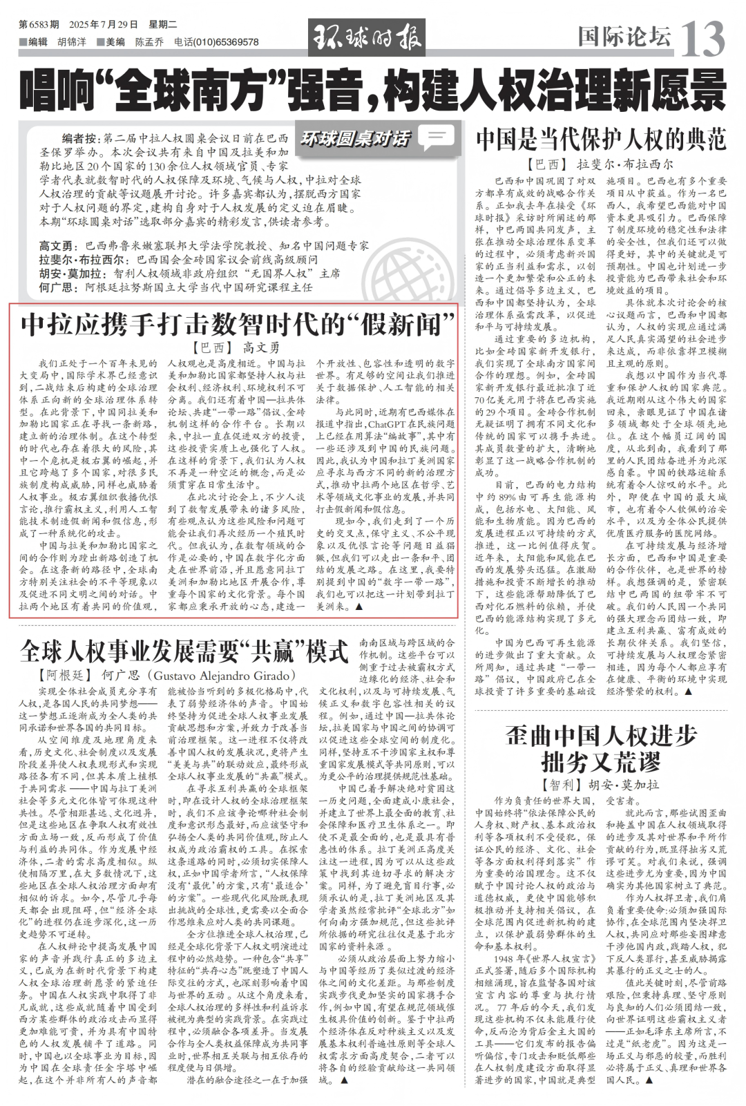【编者按】第二届中拉人权圆桌会议日前在巴西圣保罗举办。本次会议共有来自中国及拉美和加勒比地区20个国家的130余位人权领域官员、专家学者代表就数智时代的人权保障及环境、气候与人权,中拉对全球人权治理的贡献等议题展开讨论。许多嘉宾都认为,摆脱西方国家对于人权问题的界定,建构自身对于人权发展的定义迫在眉睫。本期“环球圆桌对话”选取部分嘉宾的精彩发言,供读者参考。