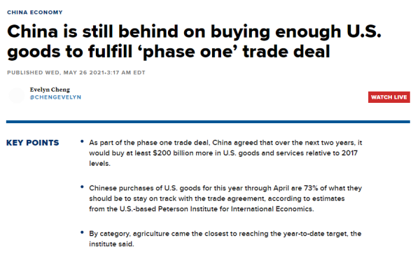 截至2021年4月,中国对美国商品的购买量为遵守贸易协定的73%。来源:CNBC