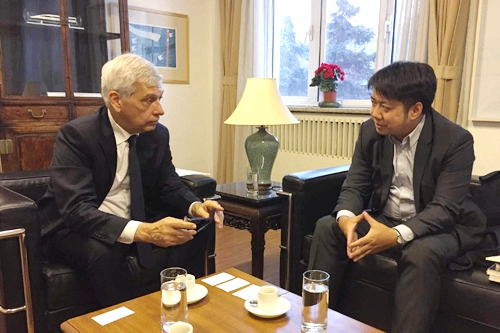 王文院长向大使先生介绍了中国近年在对外贸易和金融投资方面取得的进展和成就,尤其在“一带一路”倡议提出以后,经济增长速度大大提升。中国在经济实力增强的同时,把“一带一路”作为最重要的外交政策,希望通过给全球提供公共产品,促进全球范围内的合作与共赢。