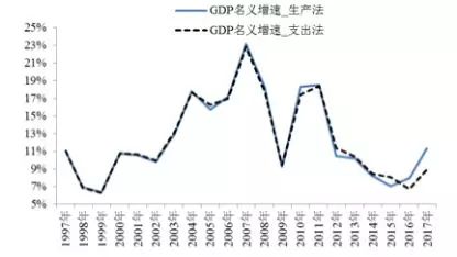 GDP核算方法有生产法、收入法和支出法等。近年来,出现了采用生产法和支出法核算的GDP差距较大的现象。从2015年开始两者的差距明显拉大,2016和2017年以生产法核算的GDP增速显著高于以支出法核算的GDP增速。