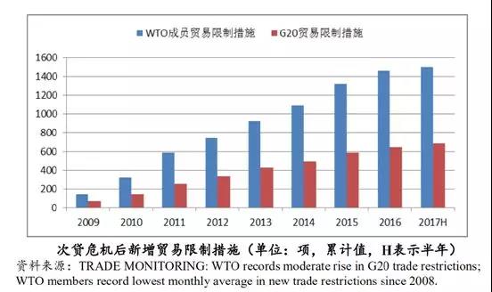 下图展示了最近几年贸易摩擦数据,也就是次贷危机以来新增的贸易限制措施和各种限制条件。考察贸易摩擦主要看G20,因为G20经济体量占全球90%,贸易占全球80%。从数据上看,G20之间贸易限制措施是增长的,因此全球贸易外部环境不乐观。