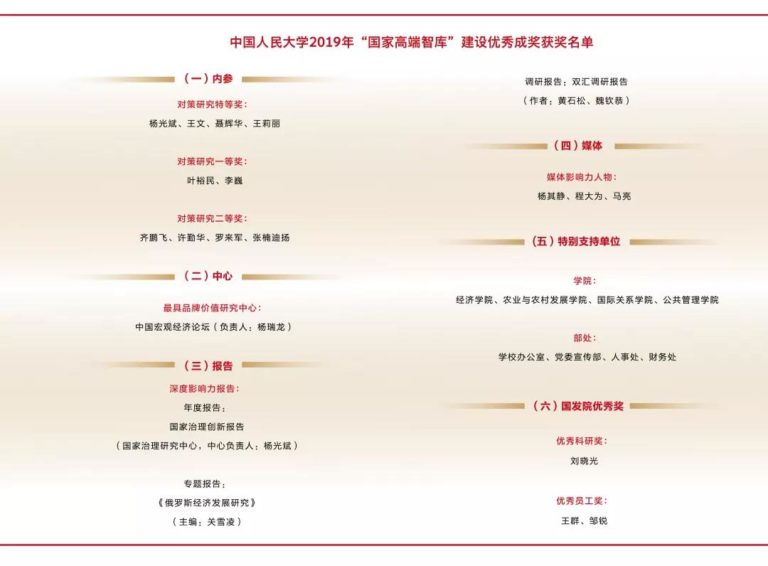 4月3日,中国人民大学2019年“国家高端智库”建设工作会议召开。会议传达了“国家高端智库”理事会扩大会议精神,并颁发中国人民大学“国家高端智库”建设优秀成果奖。
