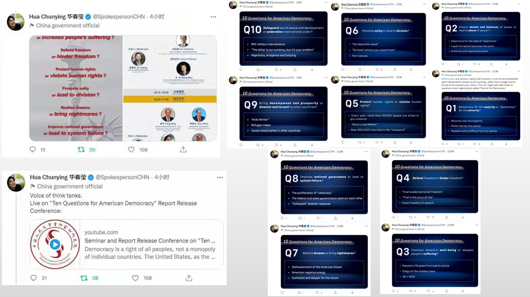 外交部部长助理华春莹在国际社交媒体Twitter上第一时间推送“十问美国民主”相关内容,12月7日更以报告中的“十问”为主题连发10条推文,对美国民主进行质问。