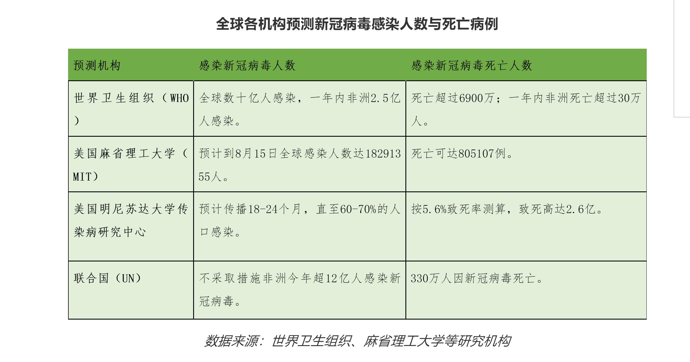 新冠肺炎疫情给全球带来了百年不遇的变化。据WHO最新研究表明,仅非洲地区预计一年内就会有15万人因新冠死亡,上亿非洲人感染新冠病毒。在最糟糕的情况下,如果人类不能在近期生产出疫苗和特效药物的话,全球77亿人口中将有超过十亿人感染,将有约6900万人会因新冠病毒死亡。如此因新冠疫情死亡的人数将远超1918年西班牙流感导致5000万人死亡的规模,甚至不亚于一场世界大战给人类生命所带来的伤害。战争结束可以立即恢复重建,而新冠肺炎病毒给人类生命、经济和社会的伤害将对人类社会产生长期而深远的影响。