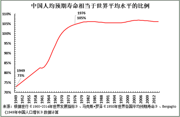 从1949年到1976年毛泽东逝世,中国人均预期寿命增长29岁——从35岁升至64岁,即这27年间中国人均预期寿命每年增长1岁多。中国人均预期寿命相当于世界平均水平的比例,从1950年的73%升至1976年的105%。
