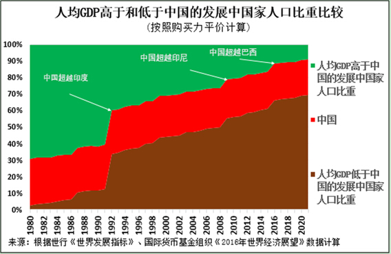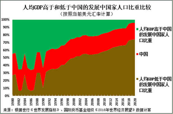 概括地说,2016年人均GDP高于中国的发展中国家人口比重不到12%,人均GDP低于中国的发展中国家人口比重为约66%——中国的国际地位彻底改变了。