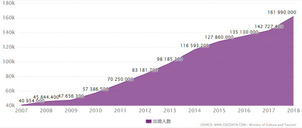 2007年至2018年中国出境人数变化趋势(图/CEIC)